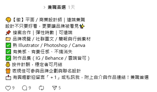 一開始在 Threads 上會發布看起來很正常的徵才貼文,有的會寫非常詳細,會讓你覺得真的有在應徵,然後再吸引想接案的人去私訊。
