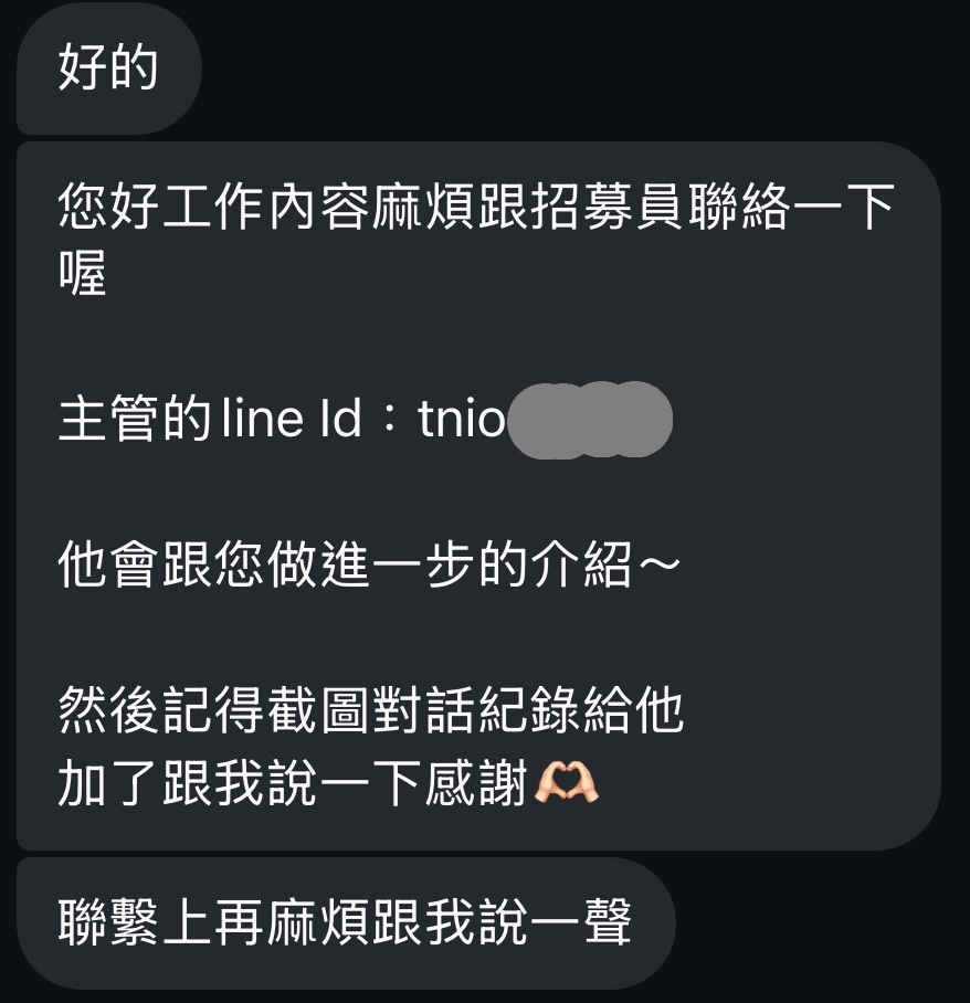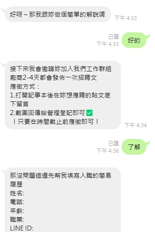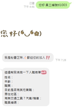 有的還會給你一組員工編號,然後再去加另一個人的 Line 說是人資要幫你審核。