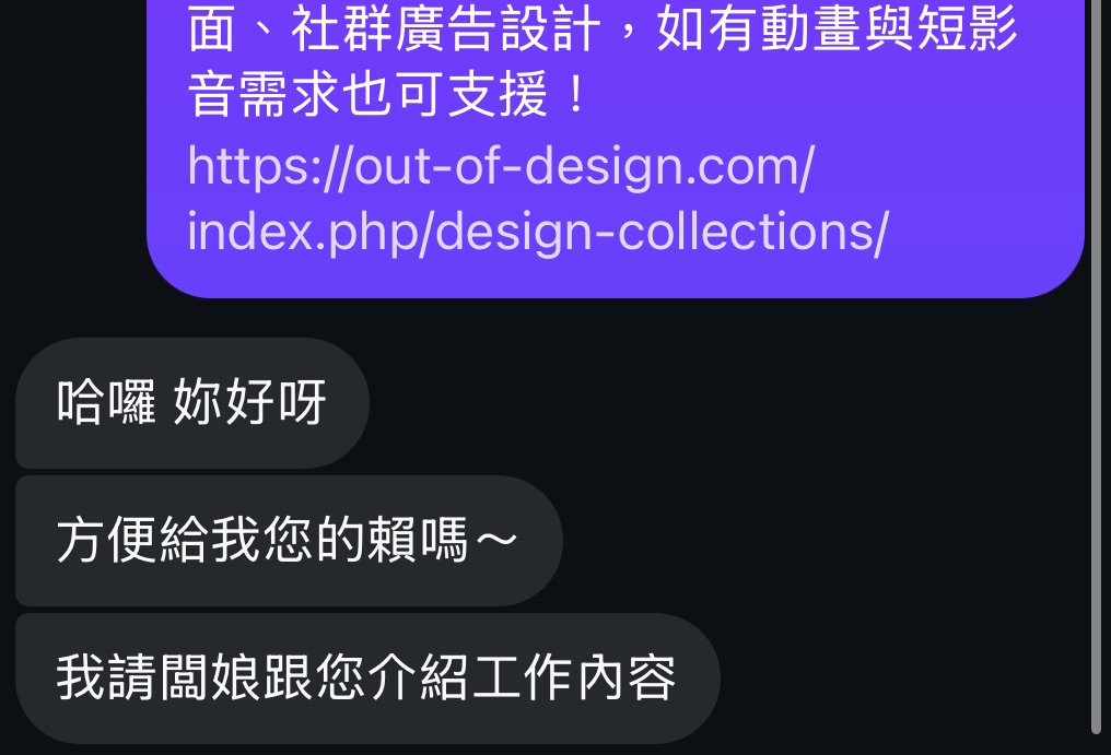 私訊之後,該帳號可能會說應徵人數眾多,直接請你加另一個人的 Line,會說是闆娘或是人資/招募員,也遇到蠻多會請你直接加官方 Line(到這個步驟基本上就七成左右不是真的來招募美編的了)